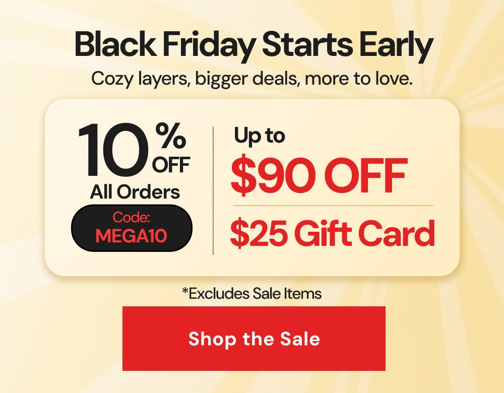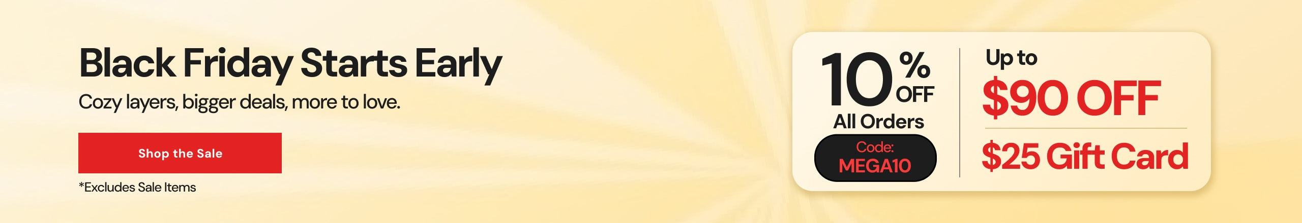 BLACK FRIDAY EARLY ACCESS — 10% OFF All Orders (Code: MEGA10) · Up to $90 OFF + Free $25 Gift Card on $199+! 🎁 Shop Now