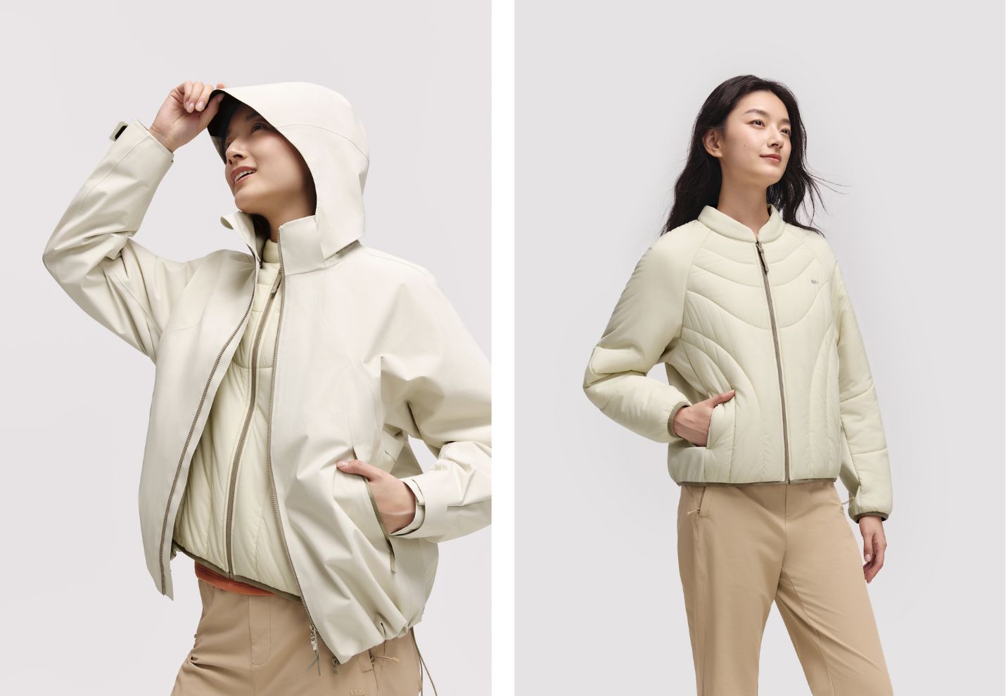 A 4-in-1 modular system lets you wear the shell, liner, or both. The shell alone suits 15°C–25°C, the liner suits -5°C–5°C, and both combined keep you warm down to -10°C. One jacket for three seasons.
