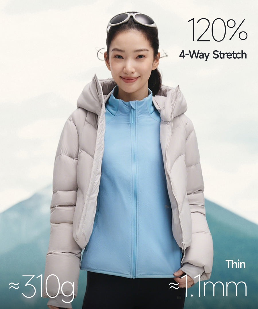 At just ~310g and 1.1mm thin, the high-stretch fabric (120% elongation) adapts to movement and layers easily without adding weight.